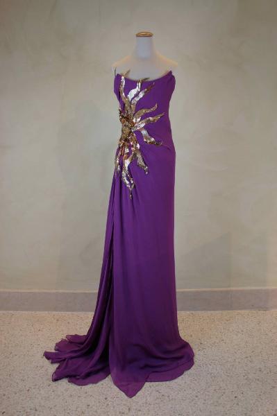 Abito lungo con scollo totale sagomato, busto aderente modellato da corpino in tulle elasticizzato color carne, a cui si unisce un tanga, bordato in taffetas stampato con motivo leopardato, sostenuto da stecche verticali ed una orizzontale, linea aderente che si apre nella gonna svasata con spacco e strascico, grande applicazione sul fianco destro, definito da un sole raggiato ricamato su un tessuto lurex, ricoperto dal filato dorato, paillettes e pietre in vetro policromo. Chiusura data da una cernierainserita nella cucitura del fianco sinistro.