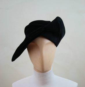 Cappello in feltro nero con calotta piccola e arrotondata, tesa asimmetrica, sulla sinistra è ripiegata sulla calotta, mentre a destra forma una sorta di visiera triangolare, doppiata in velluto nero. Etichetta cucita sul giro d'entrata