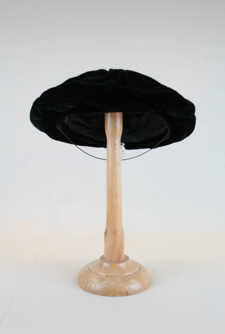Cappello in velluto nero, calotta morbida e arricciata, decorata da impunture a zig-zag che partono dal centro, segnata da un bottone rivestito in velluto. La calotta si innesta su un bordo rigido. Fodera in taffetas nero; elastico atto a trattenere il capo alla nuca.