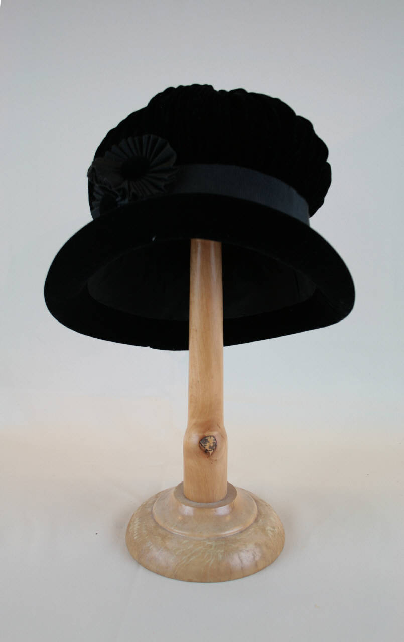 Cloche in velluto nero fittamente arricciato sulla cupola rotonda decorata, cinta in taffetas grigio effetto gros con il quale sono create anche due coccarde con, al centro, un bottone in velluto; tesa con i bordi sollevati ribordata in gros. Fodera in taffetas nero.