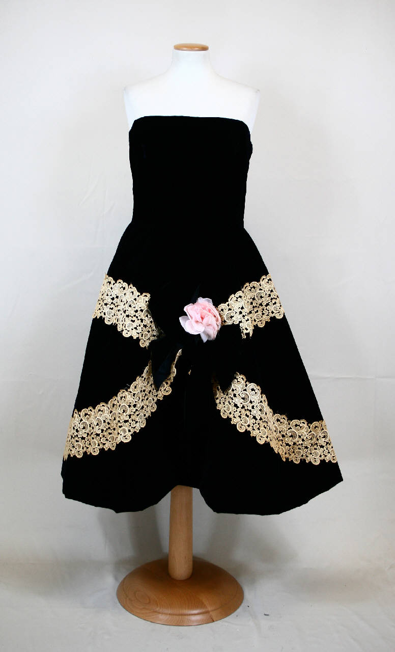Abito lungo sotto al ginocchio, in velluto nero, scollo totale dritto, modellato da tagli e pinces; sull'ampia gonna sono disposti due alti bordi in pizzo avorio decorato con motivi floreali stilizzati coi bordi a rilievo (imitazione pizzo punto Venezia a rilievo), incrociato anteriormente, dove è sovrapposto un fiocco in velluto e una rosa in organza bianca e rosa. L'abito è foderato in tela di lino nero, doppiato in taffetas nero, irrigidito da stecche e con nastro stringivita. La gonna dell'abito è doppiata in taffetas molto rado sintetico. L'abito è chiuso mediante cerniera parziale posta in corrispondenza della cucitura centrale posteriore; la fodera è chiusa mediante 16 ganci. Etichetta nell'interno del fianco sinistro.