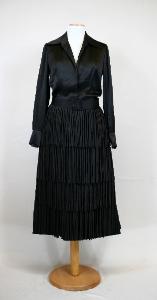 Abito in raso color canna di fucile, collo a cinturino, apertura parziale definita da 2 automatici e che continua sotto il taglio della vita con una cerniera, busto modellato da pinces; maniche lunghe blusanti, terminanti con polsino chiuso da due bottoni in strass e vetro e altrettanti occhielli; dorso in due pezzi modellato da pinces; gonna dritta con spacco laterale e decorata da quattro ranghi di frange realizzate con tubolari di raso. Busto e gonna foderati in taffetas in tono. L'abito è accompagnato da una cintura a nastro, in raso, con il retro in similpelle nero. Etichetta all'interno del fianco destro
