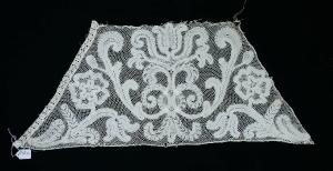 Merletto di foggia trapezoidale, in lino naturale a fuselli, tipo Milano, decorato da un trionfo vegetali speculare e da un rametto fiorito, disposto nell'angolo inferiore. Motivo realizzato a nastrino non continuo a punto tela con i bordi traforati, con riempitivi diversi, uniti da fondo torchon. Un lato obliquo è rifinito con un sottile merletto a fuselli a base treccine.