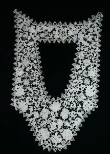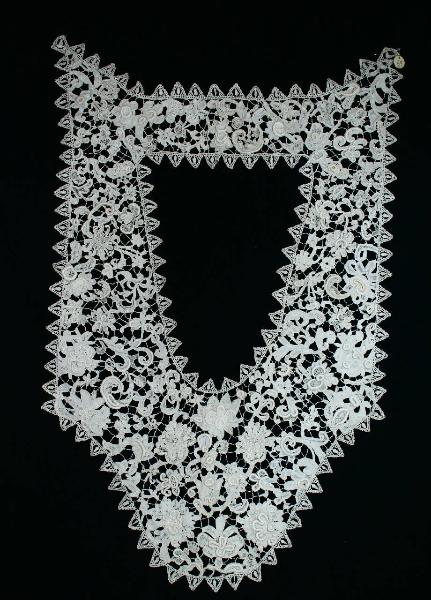 Colletto chiuso in lino avorio rettangolare, con un lato a punta, decorato con un motivo vegetale stilizzato, disposto simmetricamente rispetto l'asse mediano verticale, con punto Venezia a rilievo; barrette di unione con picot. L'oggetto è rifinito con un bordo definito da triangolini che incorniciano un motivo periforme.