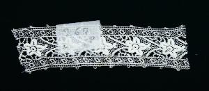 Frammento di bordo decorato con fiori stilizzati uniti al fondo a maglie esagonali mediante barrette con pippiolini. Il decoro corre fra due bande decorate da ruote che si stagliano dal fondo a rete. Dai margini inferiore e superiore si staccano piccoli cappietti.
