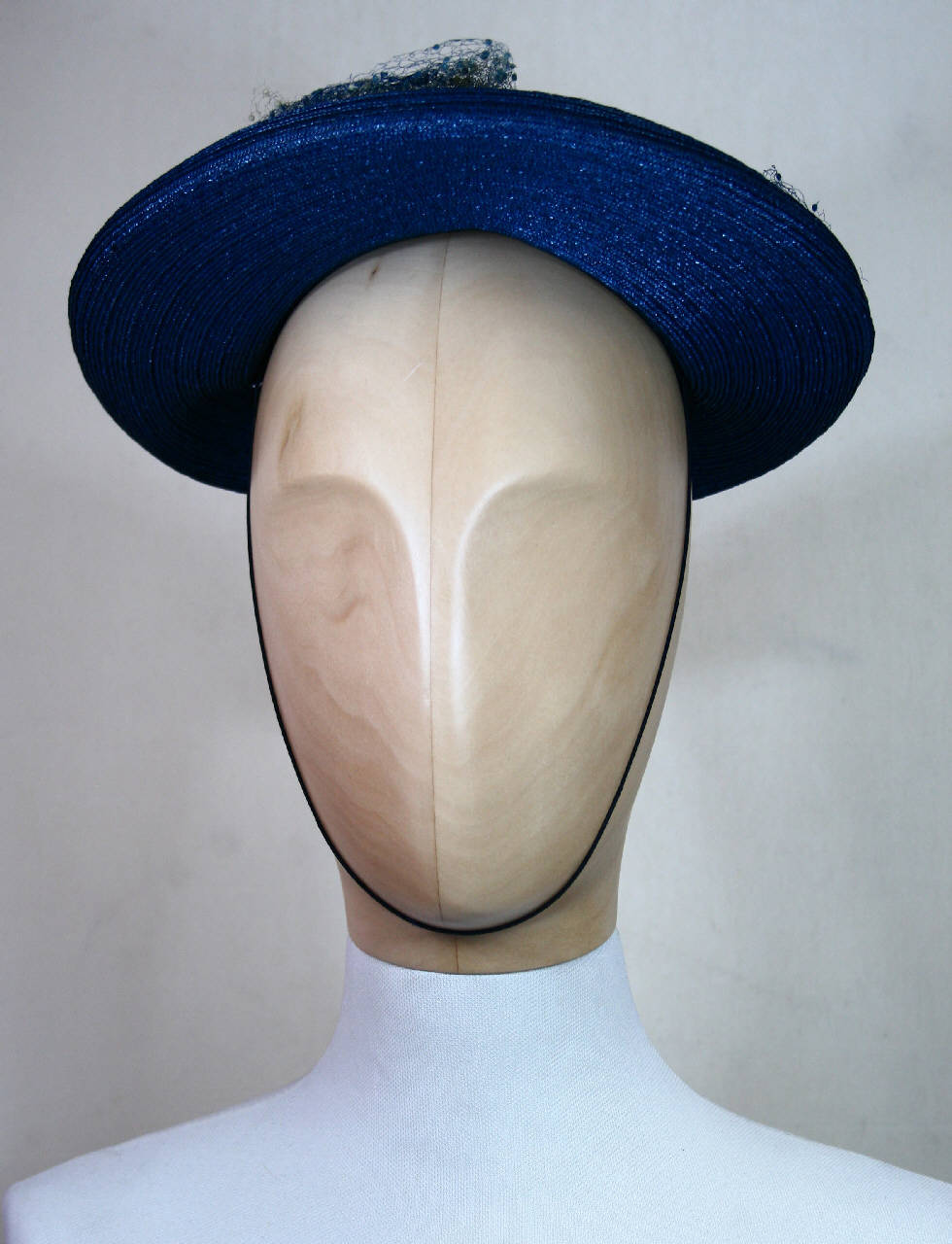 Basco in paglia blu pavone, decorato, al centro del disco, da una veletta blu ed ècru point esprit. Giro d'entrata in cannettato (ordito seta e trama cotene) nero da cui parte un elastico.