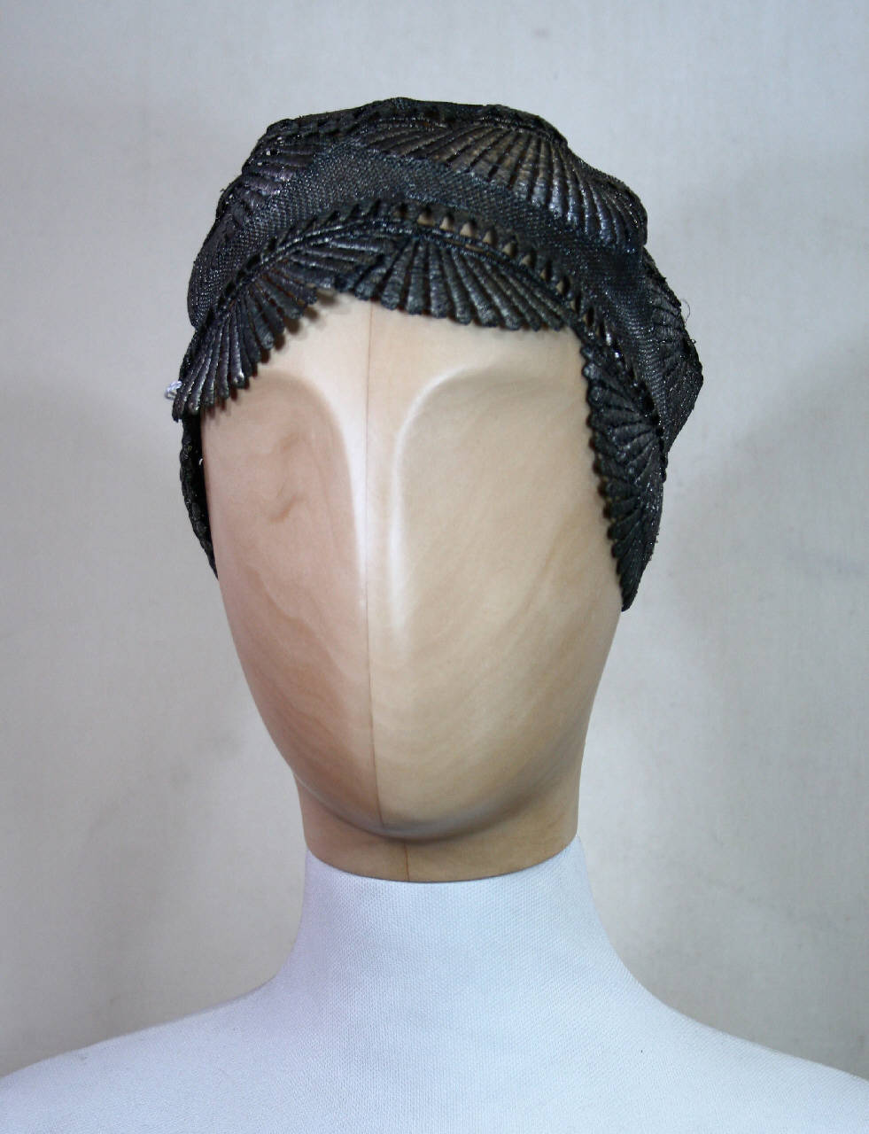 Piccola cloche con calotta cilindrica in maglia d'argento; il disco superiore e la piccola tesa sono ricamate in argento con un motivo a valve di conchiglia.