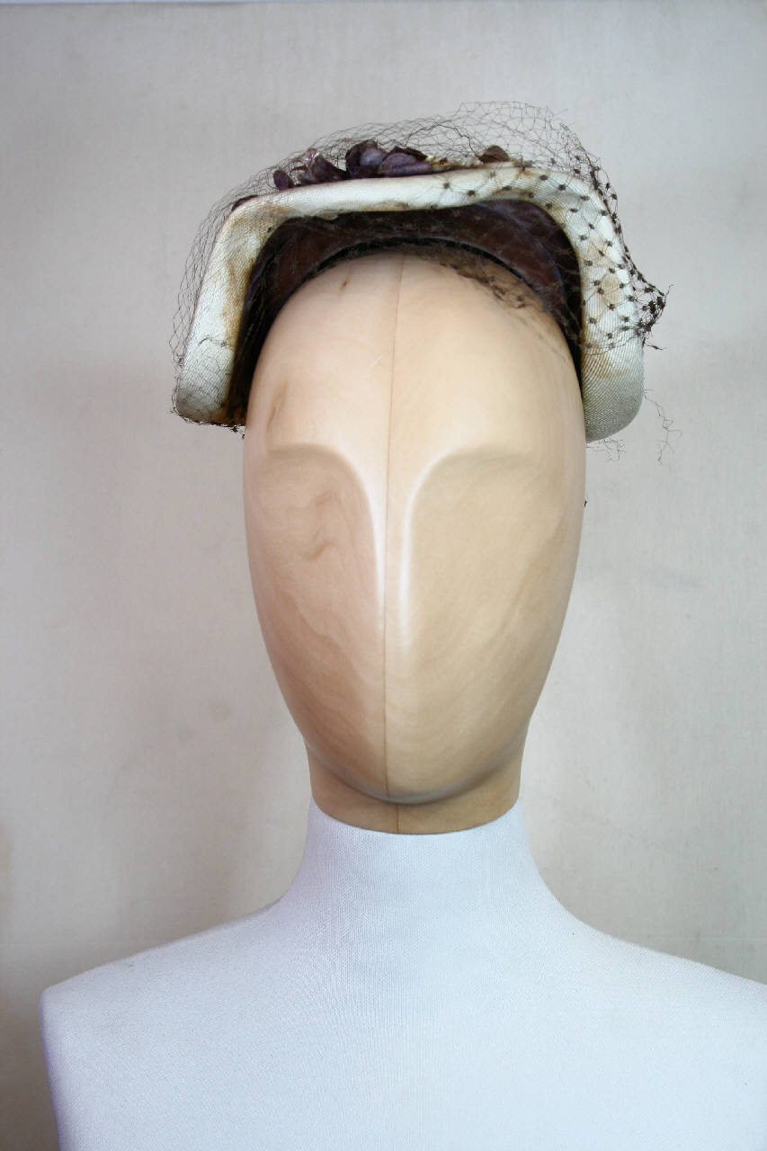 Toque con struttura in paglia rivestita internamente in velluto marrone e esternamente in velluto beige; calotta rotonda arcuata sulla fronte e ala smerlata; la calotta è completamente ricoperta da fiori naturalistici in tessuto; veletta point esprit marrone. Sono presenti due spilli con capocchia in velluto beige.