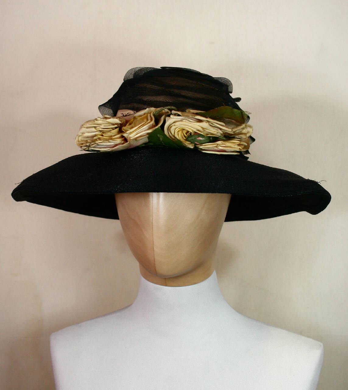 Cappello con piccola calotta creata avvolgendo a spirale un nastro in tulle nero, a cui si unisce l'ampia tesa circolare rigida in paglia nera, su cui sono applicati due fiori naturalistici gialli in tessuto. Giro d'entrata in gros, su cui è attaccata l'etichetta.