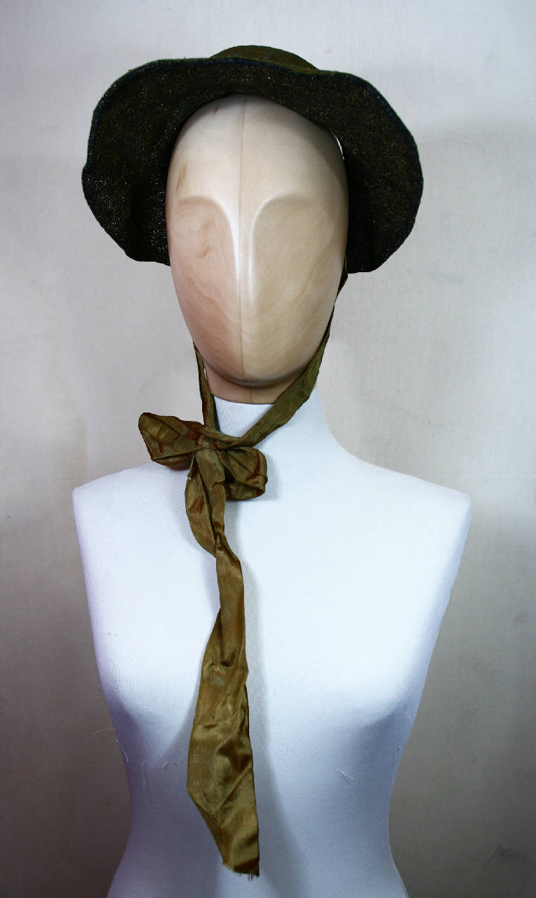 Cappello creato con galloni in filo dorato decorati da motivi floreali stilizzati; calotta cilindrica priva del disco superiore; tesa ovoidale. Calotta foderata in taffetas nero; tesa in cannettato bronzo; briglie definite da nastri cangianti (ordito verde e trama senape) in taffetas sintetico.
