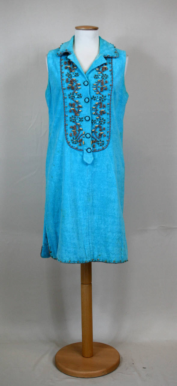 Abito al ginocchio senza maniche in spugna turchese, collo con risvolti a punte dritte, chiusura parziale data da 5 bottoni gioiello e altrettanti occhielli, un ricamo con cannette in legno, cordoncini in cotone e applicazioni in vetro color turchese crea un motivo che imita lo sparato di una camicia; ricami simili ritornano anche lungo l'orlo del colletto e della gonna; dorso in due pezzi; spacchi ai fianchi. Fodera in taffetas celeste.