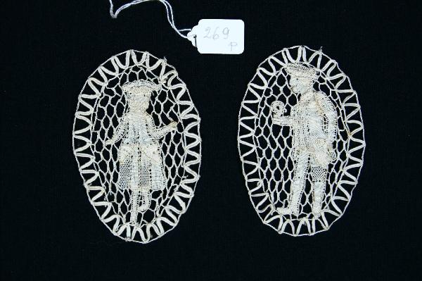 Due medaglioni ovali, raffiguaranti due figure con vesti settecentesche entro incorniciatura. L'uomo con marsina, sottomarsina e calzoni, un tricorno sul capo e stringe con la mano un oggetto non meglio identificabile; la donna con caracò, gonna sopra le caviglie portata su un piccolo panier e tricorno. La cornice è definita da trecce che racchiudono un motivo a zig-zag a punto stuoia, fondo a rete tipo Malines e figure a punto stuoia e punto de Paris.