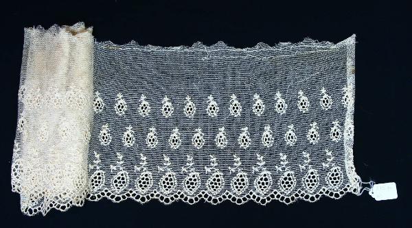 Alto bordo in tulle ricamato in cotone avorio con piccoli fiori (tipo girasole) disposti a scacchiera in teorie, con corolla traforata e rilevata; bordo smerlato percorso da un motivo a rete a maglie quadrate.