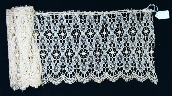 Merletto in cotone avorio, decorato da motivi circolari irregolari, con la parte centrale definita da una rete che regge un pois incorniciata da motivi sinuosi ad imitazione del mezzo punto; questi motivi si dispongono sul fondo a creare una maglia a rete romboidale che incorniciano, con andamento a scacchiera, ragnetti. Piedini a giorno e orlo smerlato ornato da ragnetti.