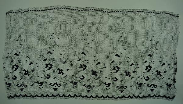 veletta in seta nera, con maglie quadrate e un motivo decorativo definito da rami fioriti fortemente stilizzati. Lungo i bordi orizzontali si stagliano due cornicette: una data dall'alternanza di quadri vuoti e pieni; la seconda con un andamento a greca.