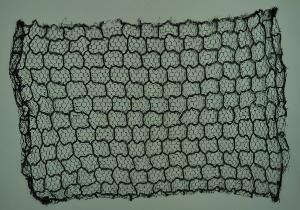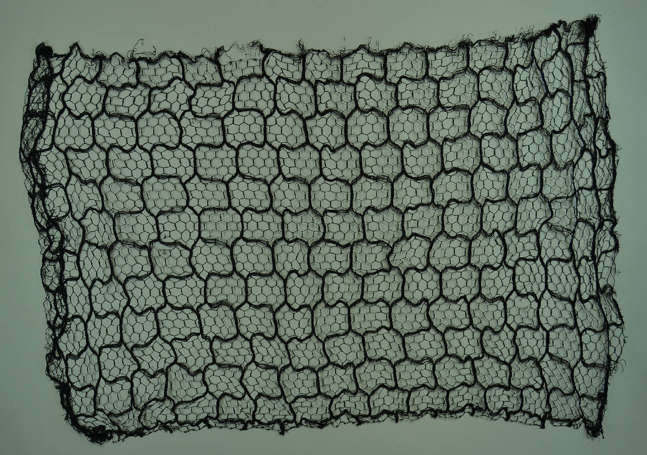veletta in seta nera a maglie esagonali, decorata da una rete a maglie rettangolari di dimensiori maggiori, creata da un filato più spesso.
