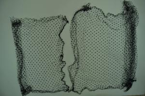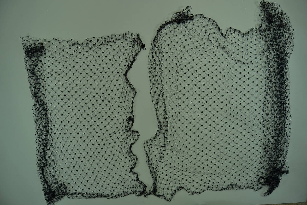 due pannelli in seta nera in rete a maglia quadrangolare, decorata da un motivo a piccoli pois realizzati con un filato più spesso e disposti a scacchiera.