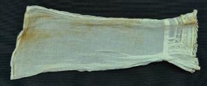 Sottomanica in tela di lino rada avorio, in un pezzo, leggermente blusante, con la parte terminale sottolineata da un bordo a cui si unisce il polsino arricciato, definito da un tramezzo di lino a cui si unisce un merletto in cotone ad imitazione di pizzo a fuselli ornato da un sinuoso tralcio fronzuto, a cui si unisce un secondo tramezzo sagomato ricamato con un serto fronzuto a punto reale e punto piatto. L'orlo del polsino e quello del tramezzo in merletto sono rifiniti con un pizzo avorio, ornato da motivi a occhio di pernice.