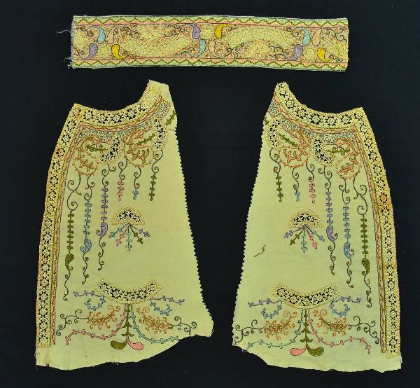 Il manufatto è realizzato in panno avorio, ricamato a punto catenella in cotone policromo (verde, rosa, giallo, azzurro), oro filato, paillettes dorate e perline. Due pezzi costituiscono i due quarti anteriori del busto, con il ricamo definito da foglie a goccia e tralci stilizzati fronzuti. Alcuni dettagli del decoro, lo scollo e il bordo dell'apertura sono rifiniti da un merletto meccanico in cotone avorio con motivo a specchiature polilobate trattenute da motivi a riccio; i bordi sono sottolineati da motivi a cerchio; lo stesso merletto crea una finta patta. Completa l'insieme una alta fascia rettangolare, doppiata in taffetas bianco, rifiito da una cornice ornata da un motivo a zig-zag.