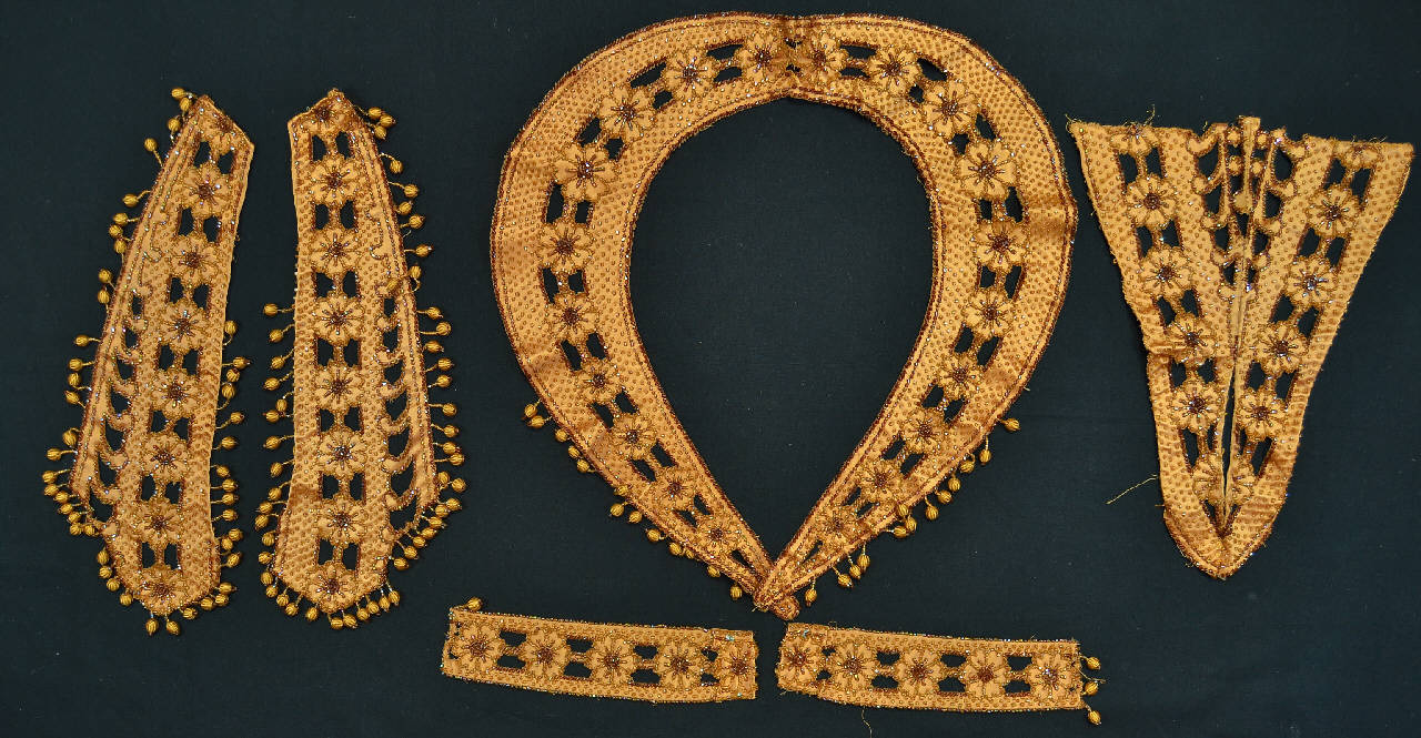 decorazione per abito femminile, costituita da una sorta di collo piatto, una pettorina (?) triangolare; due elementi rettangolari e due elementi sagomati, in raso bronzo, doppiato in raso bronzo. Il decoro è definito da un motivo a fiori eseguito a ricamo ad intaglio, è impreziosito dall'applicazione di perline color ambra, disposte lungo i contorni e applicate a scacchiera sul fondo. Tutti i pezzi ad esclusione della pettorina, sono rifiniti da piccole perle in legno sagomato, rivestite in raso e trattenute da briglie in perline.