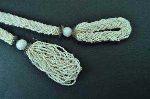 collana definita da un cordone in perline bianche, terminante con una grossa perla posta fra due elementi metallici a semisfera traforati. Un lato termina con un cappio; il secondo con una nappa.