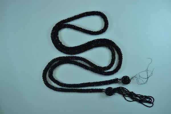 collana definita da un cordone in perline nere, con parte terminale definita da un motivo a nappa.