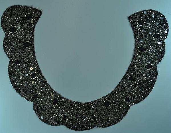 Parure definita da collo piatto e due polsini, di cui uno cucito, in crespo nero ricamato con perline in vetro che coprono tutto il fondo, lasciando scoperti motivi a pois disposti a scacchiera, unitamente a paillettes di specchio e strass. Collo con orlo smerlato e polsini trapezoidali.