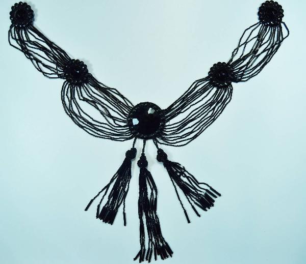 la decorazione è definita da 5 dischi sfaccettati di jais incorniciati da perline e incollati su diagonale nero; i dischi sono collegati fra loro da fili in perline e cannette; sul terzo disco, di maggiori dimensioni, sono uniti tre fiocchi in jais. Su uno dei dischi è cucito un gancio maschio in metallo.