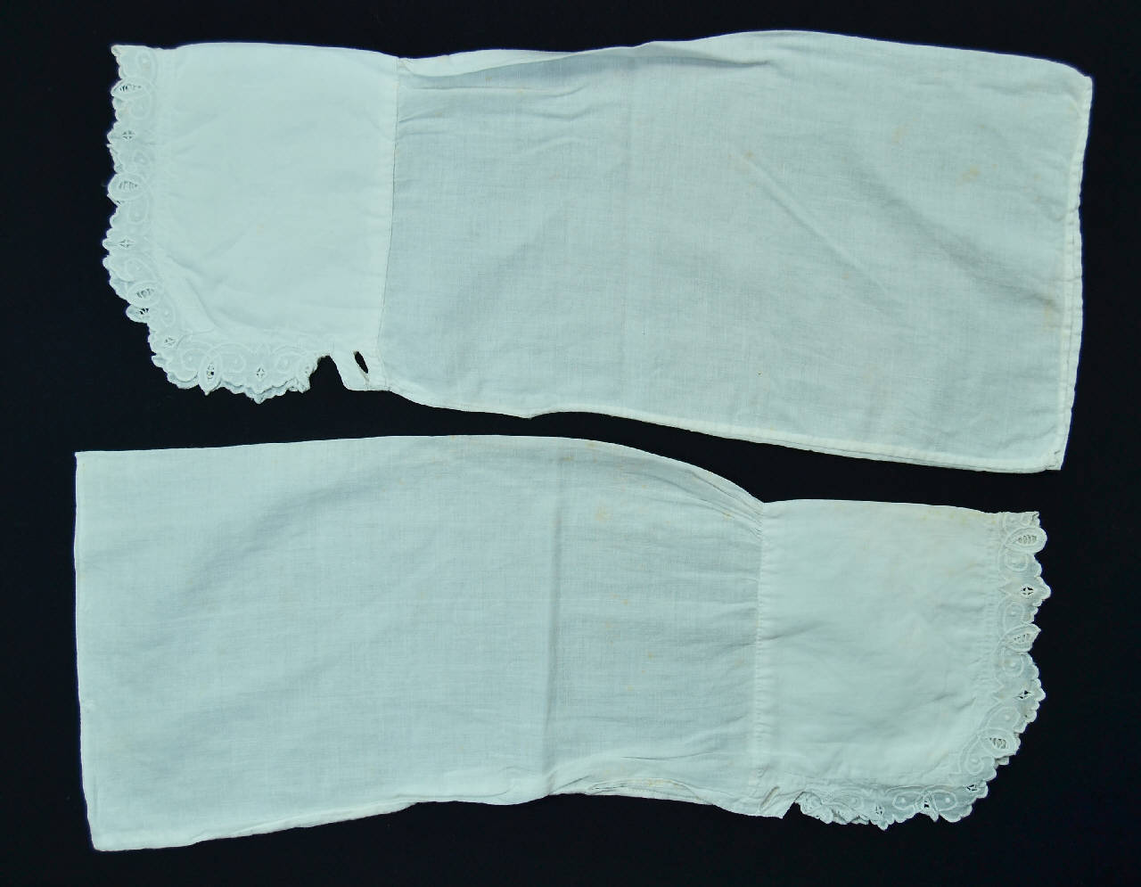 Paio di sottomaniche in tela di lino bianco con alto polsino decorato lungo il bordo da un motivo a ricamo in cotone bianco, a punto festone, punto piatto, ad intaglio nel definire piccoli rombi con barrette. Il ricamo definisce un motivo a palmette stilizzate che crea un orlo smerlato. Chiusura definita da una coppia di occhielli.