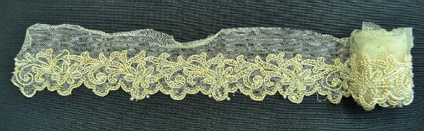 tulle in cotone crema ricamato con un tralcio fiorito e stilizzato con perline e cordoncino in seta crema; gli stessi materiali rifiniscono l'orlo smerlato.