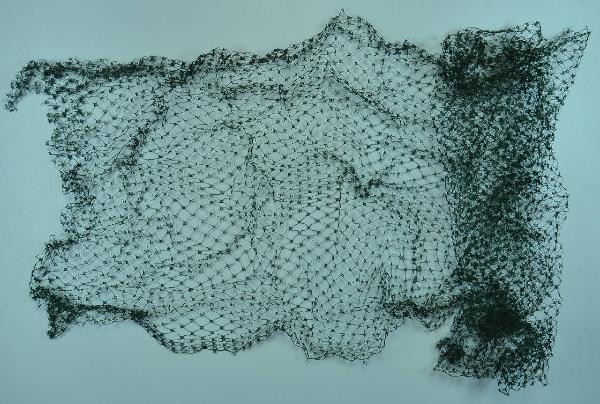 Tulle verde, ad ampie maglie romboidali, raccordate fra loro mediante piccoli quadratini disposti a scacchiera.
