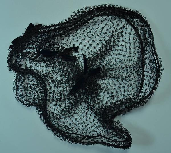 acconciatura in tulle nero, con maglie romboidali unite fra loro da un motivo a piccoli quadrati; è decorata da tre fiocchi in velluto nero; lungo il bordo corre una coppia di sottili nastri in paglia nera intrecciata.