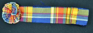 Cintura confezionata in diagonale rigato e barrato con un motivo "scozzese" nei toni dell'azzurro, bianco, giallo e rosso. A nastro, con gala, chiusura effettuata da due ganci e due asole.