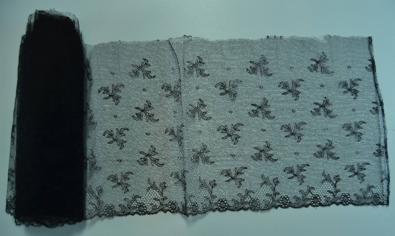 bordo in seta nera, fondo a rete a maglie esagonali, su cui si staglia un motivo a rami spezzati disposti a scacchiera; bordo decorato da rami fioriti. Il decoro è dato da diverse reti ed è sottolineato da un filato di maggiore spessore.
