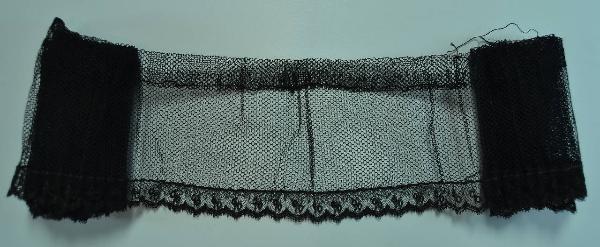 Bordo in cotone nero definito da un tulle meccanico a cui è cucito un sottile merletto nero, con orlo festonato e decoro definito da una farfalla stilizzata; il merletto presenta il fondo a maglie romboidali.