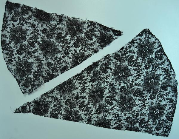 Due pannelli triangolari in seta nera, fondo a maglie esagonali decorato con grandi fiori naturalistici disposti a scacchiera e collegati da rametti fiotiti e fronzuti che formano festoni. Il decoro, rialzato da filati di maggiore spessore, è eseguito con diverse tipologie di reti.