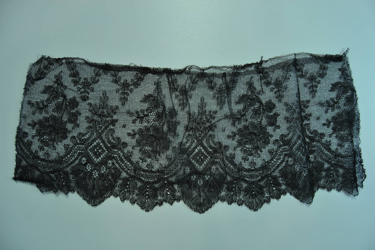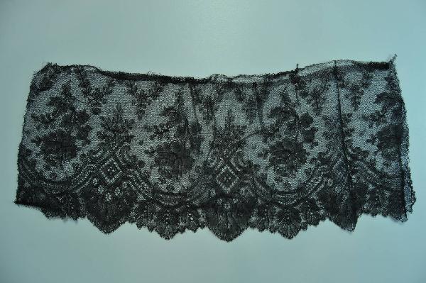 Polsino chiuso ad anello, confezionato in merletto nero: fondo a maglie esagonali e decoro definito da tralci fioriti e fronzuti; lungo il bordo si staglia un motivo ad archi a tutto sesto, intervallati da specchiature romboidali , sulle quali si appoggiano fiori a palmetta che conferiscono all'orlo un andamento smerlato. Il decoro, sollevato da filati più spessi, è eseguito con diverse tipologie di reti.