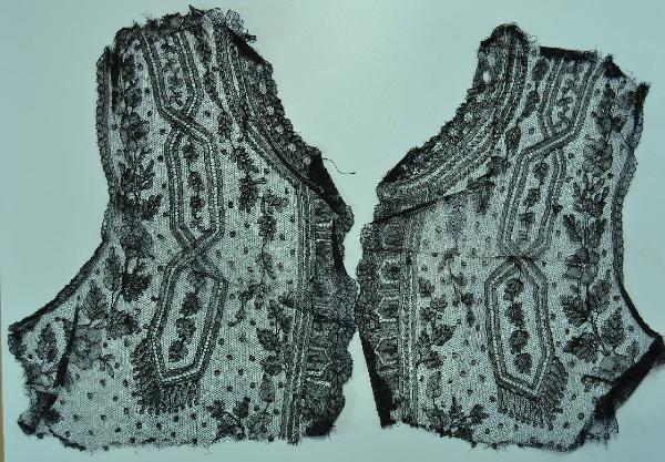 Il pizzo, con decoro a disposizione, proviene da una veste femminile, forse una veste da camera. Due pannelli sono sagomati per adattarsi alla parte anteriore del busto, con fondo a maglie esagonali e decoro definito da specchiature esagonali che incorniciano tralci fronzuti; ai lati si dispiegano tralci fioriti e fronzuti; il bordo dello scollo e dell'apertura è rifinito con fiori che creano un effeto di smerlatura. Il dorso, frammentario, ripropone lo stesso decoro, unitamente a grandi trionfi di foglie; l'orlo è percorso da specchiature ornate da fiori.