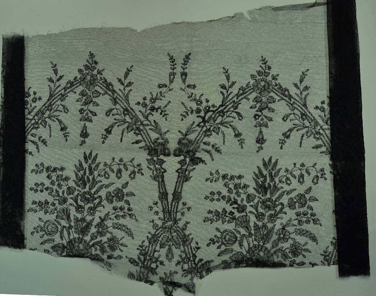 Frammento in seta nera con fondo a rete meccanica su cui sono stati applicati merletti a fuselli per definire il decoro, dato da trionfi vegetali inseriti entro incorniciature ovoidali definite da cornici a perle su cui si avviluppano tralci fioriti e fronzuti. Il disegno è integrato con inserti in pizzo meccanico.