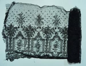 Merletto in seta nera: fondo a maglie esagonali, su cui si staglia una rete a maglie mistilinee realizzata da tralci fioriti e fronzuti; le maglie racchiudono specchiature mistilinee centinate che inscrivono rami fioriti; l'orlo è movimentato da rami fioriti. Il decoro, sollevato da filati di maggiore spessore, è realizzato con diverse tipologie di reti.