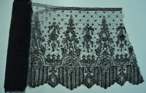Bordo in seta nera, fondo a maglie esagonali, decorato da un minuto motivo a pois disposto a scacchiera; il decoro principale è dato da motivi a voluta che reggono specchiature circolari, tali motivi sono intervallati da tralci fioriti e sono posti sopra una cornice a piccole centine, decorata da corolle stilizzate, da cui si origina una ricca frangia, con le briglie intervallate da girasoli. Il decoro, sollevato da filati di maggiore spessore, è realizzato con diverse tipologie di reti. Alto piede.