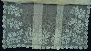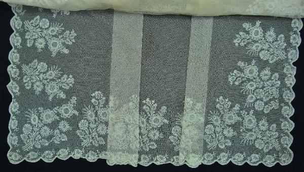 Scialle quadrato avorio, fondo a maglie esagonali e decoro, definito da mazzi fioriti e fronzuti, che si dispongono lungo l'orlo smerlato percorso da piccoli fiori. Il decoro è definito da diverse tipologie di rete ed imita la lavorazione ad application de Bruxelles.
