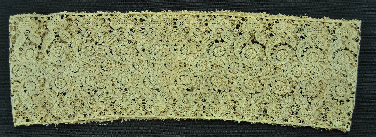 Bordo cucito ad anello, in cotone avorio, decorato da un motivo floreale disposto specularmente sull'asse mediana orizzontale, i motivi floreali sono uniti da piccole barrette e motivi a ruota. Piede al margine superiore e inferiore.