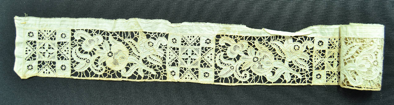 Bordo in tela avorio, decorato da specchiature occupate da tralci fioriti e fronzuti che emergono dal fondo campito da piccole barrette, interposte a specchiature quadrate, ricamate ad intaglio con motivi geometrici a cerchio, ruota e triangoli disposti a scacchiera intorno ad un motivo a quadrifoglio. I decori sono rifiniti con punto festone; riempitivi dati da reti e punto croce.