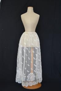 grembiule con fondo a maglie esagonali sul quale si adagiano, disposte a scacchiera, foglie stilizzate; lungo l'orlo si dispongono mazzi floreali che sottolineano i rametti fioriti e stilizzati che corrono lungo l'orlo; in vita una fettuccia in cotone per chiudere il grembiule. Il decoro è sottolineato da un filato più spesso.