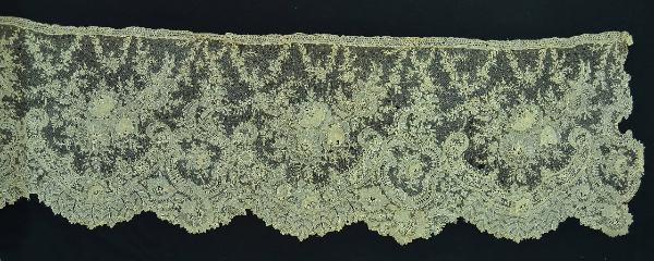 Bordo in lino avorio tipo Point de Gaze: sul fondo a rete si staglia un ricco e opulento motivo a ghirlande floreali naturalistiche, impreziosiscono il disegno volute e girali sia fitomorfi che ornati da medaglie e motivi a raggiera; l'orlo, dall'andamento smerlato. è arricchito da motivi floreali e da foglie stilizzate. Il disegno, sollevato da un filato più spesso, è definito da reti di diverse tipologie. Alto piede a fuselli cucito al bordo superiore.