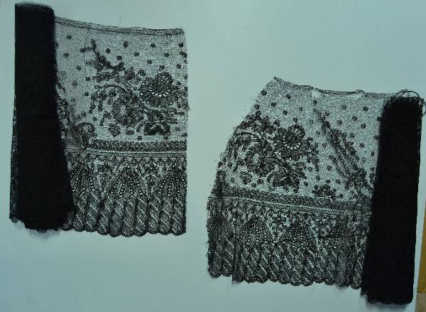 Bordo in seta nera, fondo a maglie esagonali, decorato da un minuto motivo a pois disposto a scacchiera; il decoro principale è dato da tralci fioriti e fronzuti disposti sopra ad una cornice ornata da un motivo a perle e sotto cui corrono grandi nappe. Il decoro, sollevato da filati di maggiore spessore, è realizzato con diverse tipologie di reti. Alto piede.