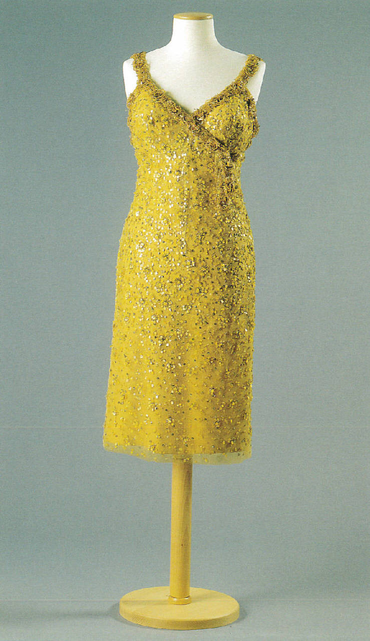 L'abito intero da sera a tubino, di tulle a due strati giallo e albicocca, è montato su una sottoveste di taffetas, doppiata con due strati di organza gialla e arancione. Il modello, tagliato sotto il seno, ha la scollatura a cuore sul davanti e diritta sul dorso, sorretta da spalline. Spalline e scollatura sono rifinite con un bordo ricamato a mano ad applicazione di filze di canutiglia giallo-oro, foglioline d'oro, strass, grosse pietre giallo topazio e paillettes, che crea un effetto di sormonto e si conclude con un nodo asimmetrico a sinistra. Il tulle giallo è completamente ricoperto da un ricamo digradante a motivi floreali di paillettes gialle e oro di forme diverse e perline di vetro dorate.