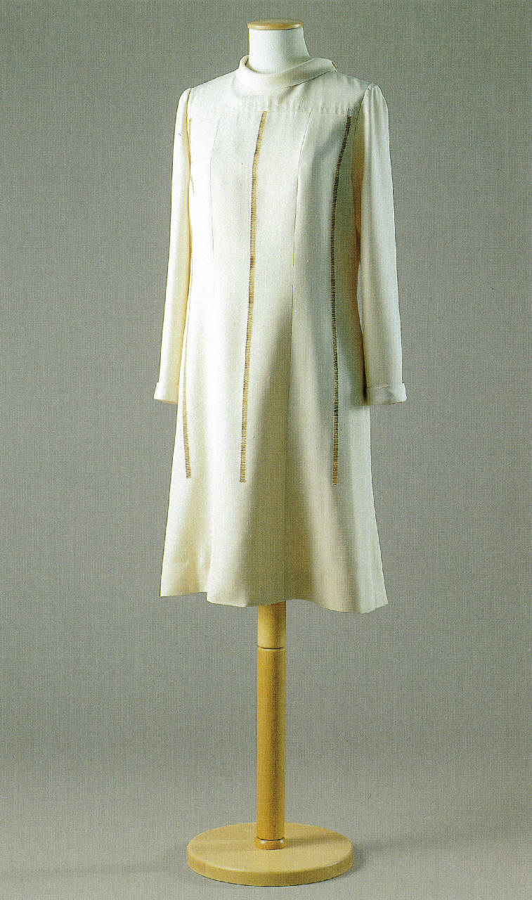 Abito intero corto, leggermente svasato e foderato di taffetas bianco, con il colletto a sciarpa montato ad anello e annodato sul lato sinistro. Spalle con carré e maniche lunghe con paramani in sbieco rivoltati. In vita, passanti per cintura (mancante).\nDal carré a metà della gonna, il modello è decorato con sei righe verticali di ricamo ad ajour eseguito a mano con filo écru e foderate di chiffon, disposte al centro dei teli che costituiscono l'abito.
