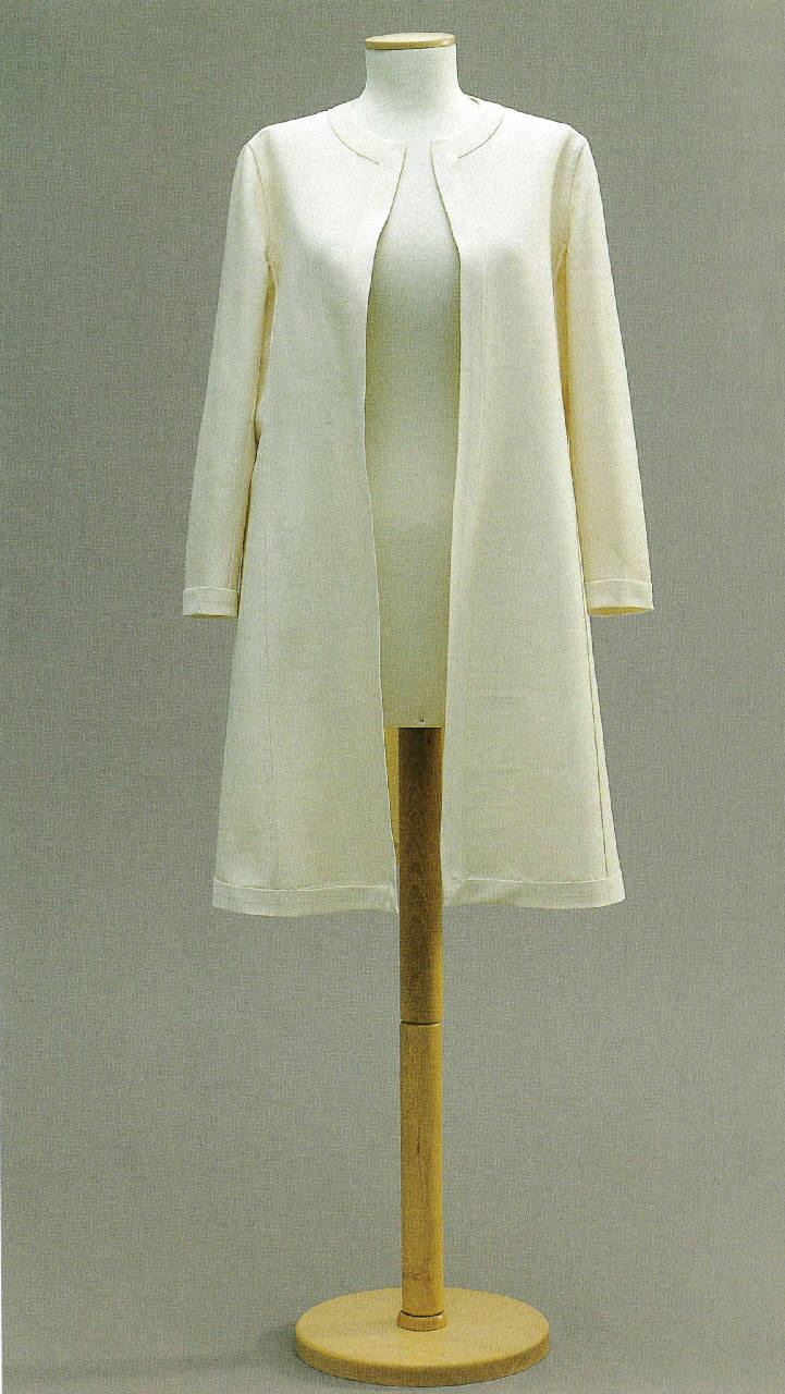 Soprabito svasato, a un petto, senza allacciatura e a giro collo. Una piega sulla spalla copre l'attaccatura a giro della manica. Il capo è interamente rifinito con un bordo in sbieco dello stesso tessuto.